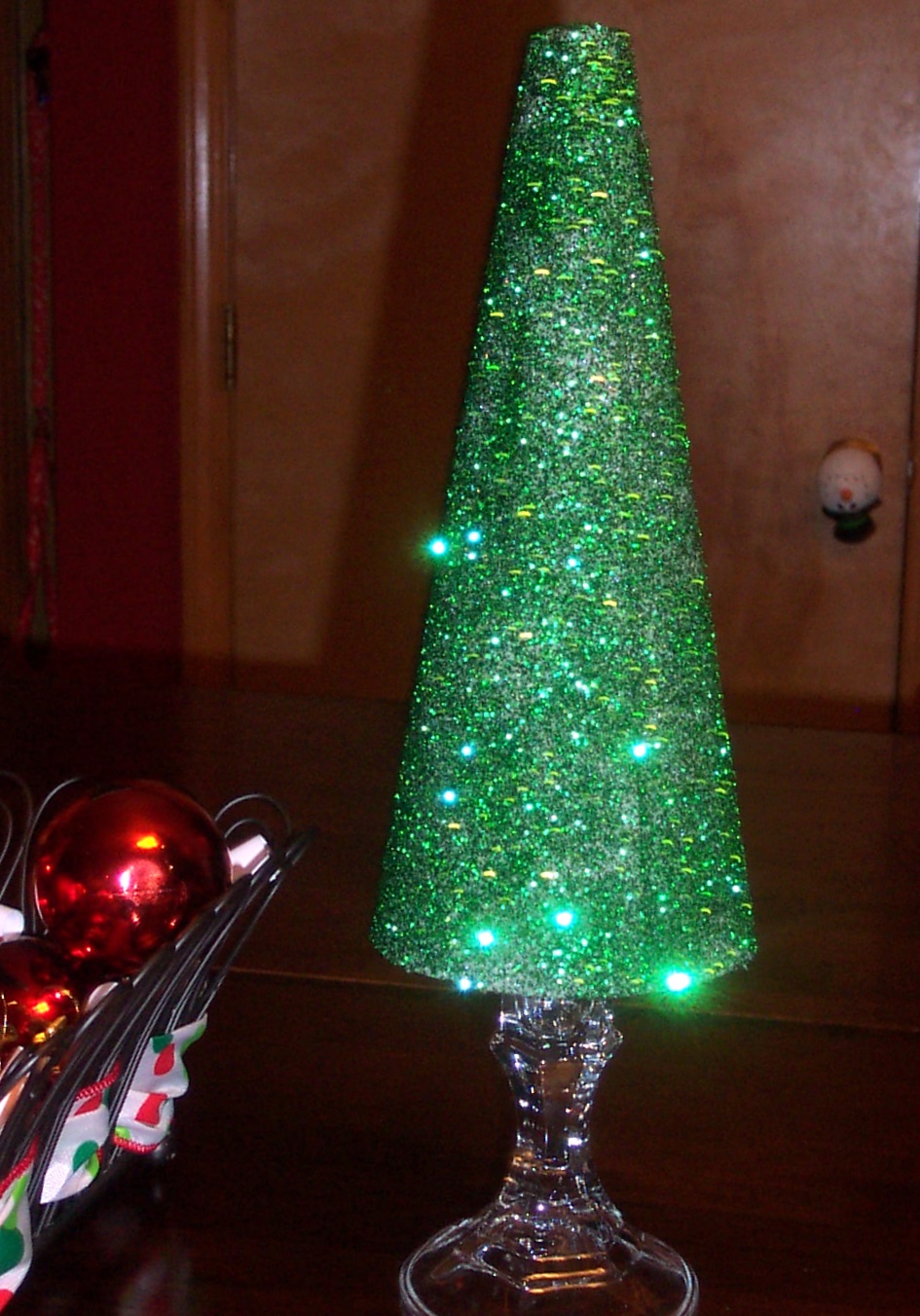 My cheap project. I got styrofoam cones at the dollar tree, bought red, green and silver glitter there as well in a pack of 3, and picked up candle stick holders.